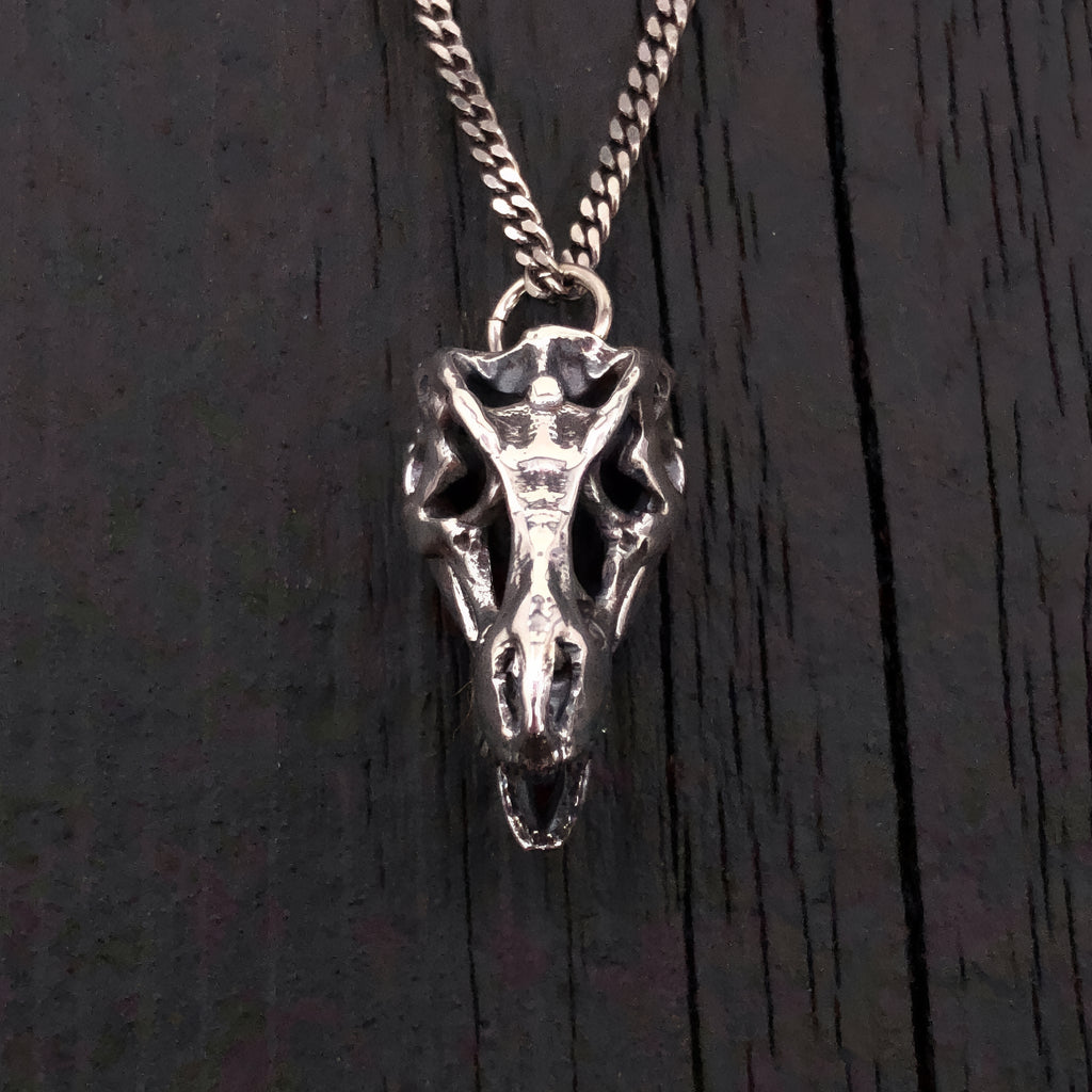 The T-Rex Skull Necklace by Moon Raven Designs is a stunning sterling silver necklace featuring a highly detailed 3D dinosaur pendant that captures the essence of the prehistoric era. This mini T-Rex pendant measures just 1 inch long from the tip of its nose to the back of its skull, making it a rare dinosaur necklace perfect for those who appreciate unique skull jewelry. Crafted from solid sterling silver, this silver dinosaur charm showcases precise detailing so refined that you can count each spaced tooth, which are thinner than an ordinary pin. Wearing this animal bone necklace offers a bold statement and a connection to ancient history, while the durable sterling silver necklace ensures lasting shine and quality. This fossil pendant necklace is backed by Moon Raven Designs’ reputation for exquisite craftsmanship and attention to detail.