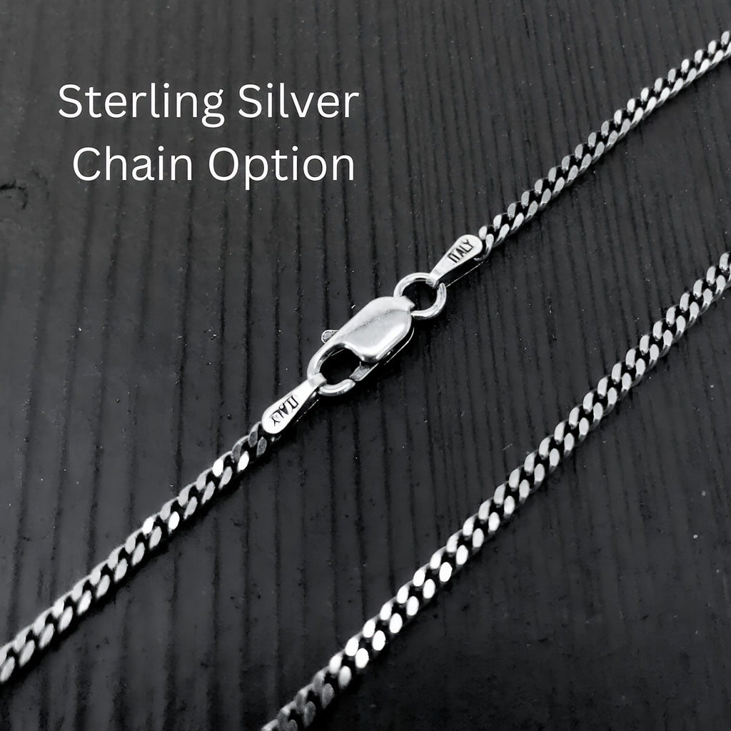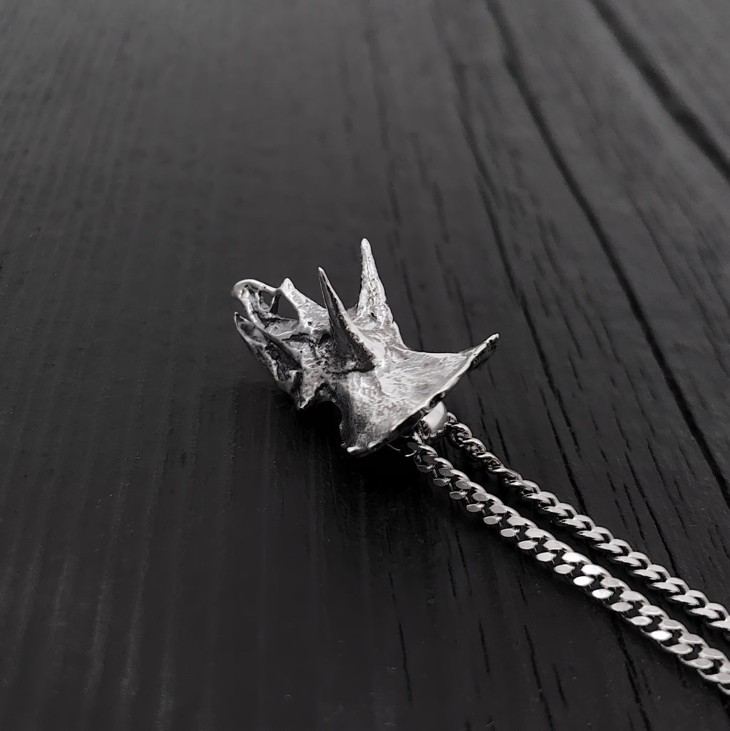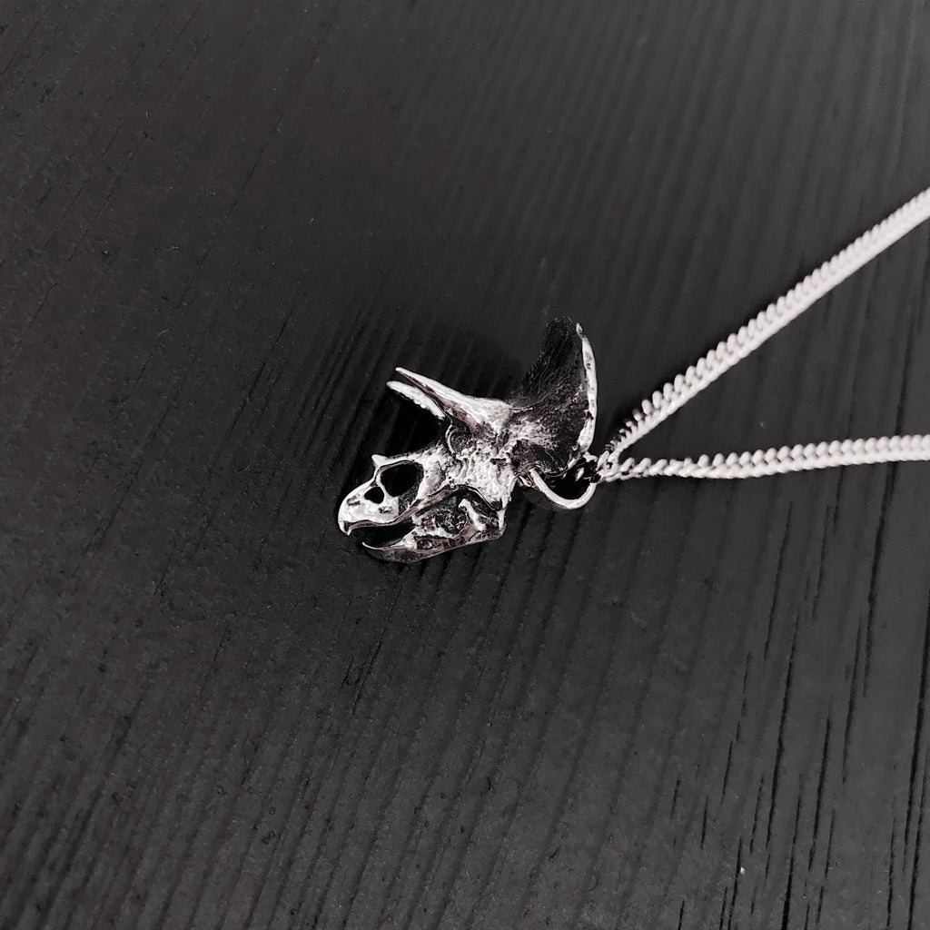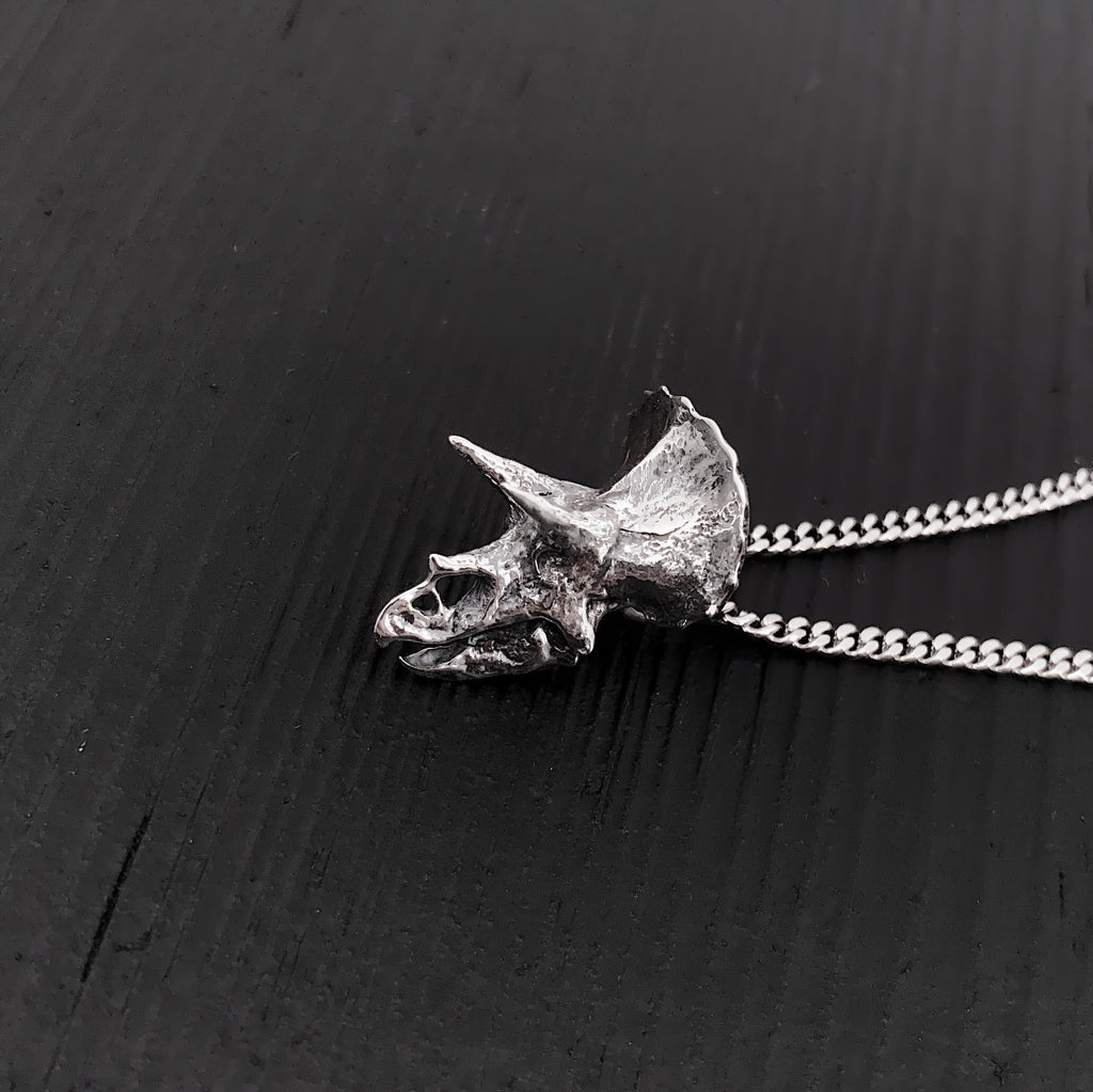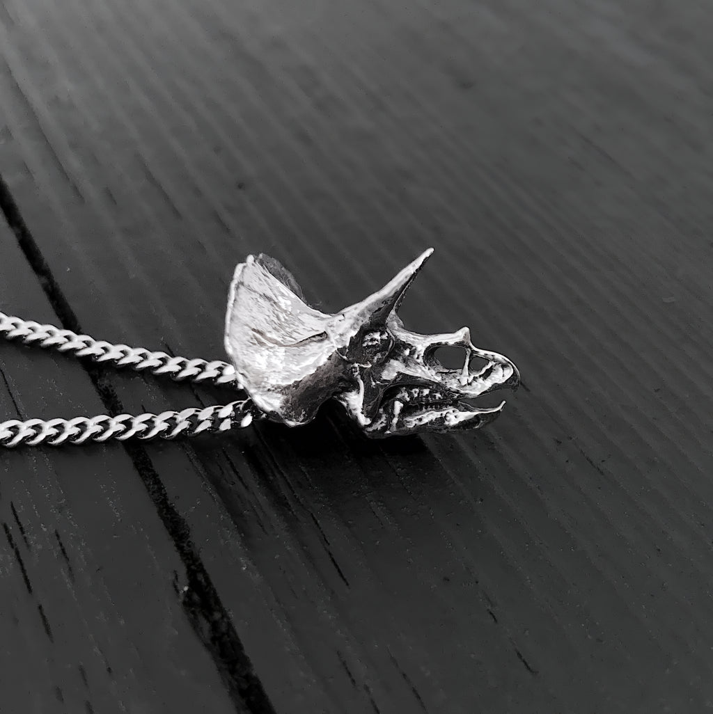 This miniature 3D triceratops skull is extremely detailed considering it only measures 3/4" long. It is made of highly polished sterling silver oxidized in the recesses to enhance the fine details. Small enough that it can be worn anywhere and would make a great gift for any dinosaur enthusiest. Comes on a Stainless steel chain.